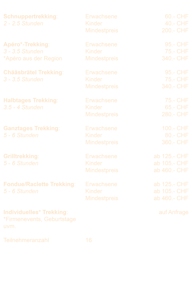 Bei Buchung fallen 50% des Trekkingpreises an. Falls das Trekking wegen schlechtem Wetter, von uns abgesagt werden muss, wird der Betrag sofort zurück überwiesen.